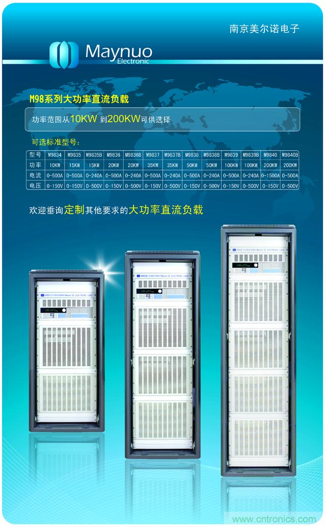 【導(dǎo)讀】近日,南京美爾諾推出多種型號的M98系列大功率直流負(fù)載,可提供選擇的功率范圍是10KW到200KW。如有其他要求,歡迎垂詢??靵砜纯窗伞?/strong>